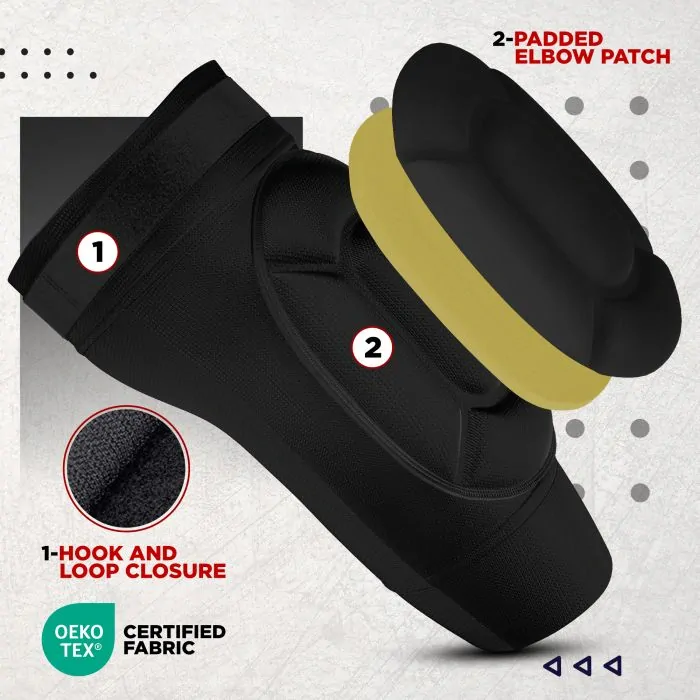 Premyslene navrhnuté s certifikáciou OEKO-TEX® Standard 100 pre bezpečnosť, prémiovým elastickým polyesterom pre pohodlie a pokročilou penou Max-ShockTM Equilibrium Foam a vypchávkou SpongeX pre ochranu. Zabudovaná náplasť na lakte znižuje silový náraz, zatiaľ čo elastické zapínanie na suchý zips zaisťuje bezpečné uchytenie. So 7-palcovými širokými podložkami získate neobmedzený pohyb. Účinne chránia tlakové body lakťa a sú vybavené priedušnými, pot odvádzajúcimi materiálmi, ktoré je možné prať v práčke.